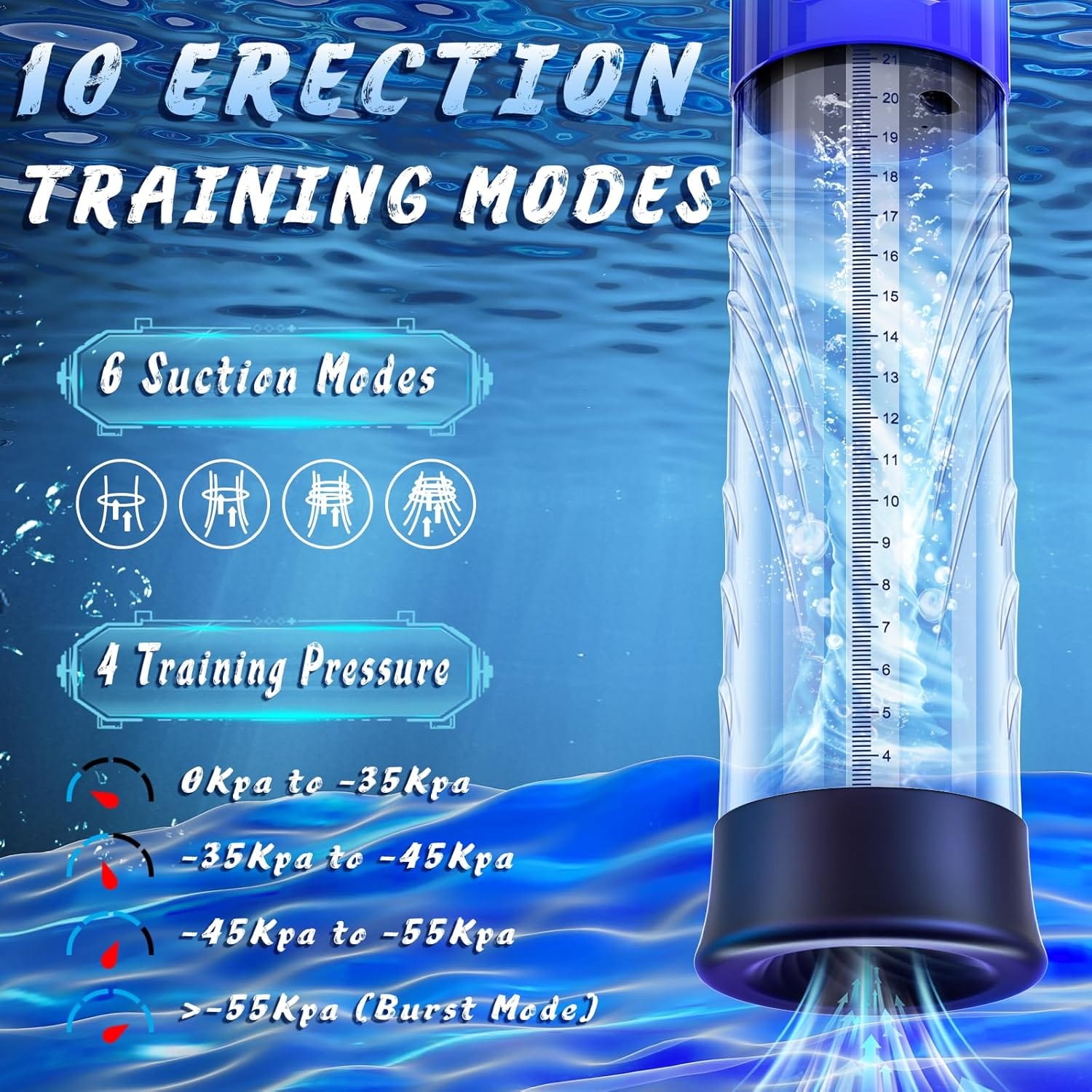 Offers 6 auto-suction modes and 4 negative pressure levels (-35Kpa to -55Kpa). One-touch Burst Mode reaches 60Kpa, catering to beginners and advanced users for personalized training.